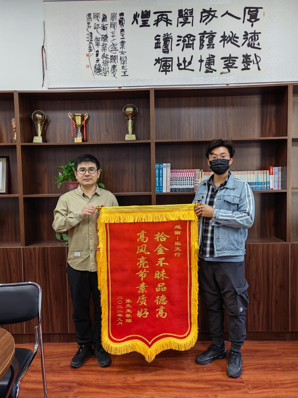 公司制药工程系教师张天行于今年1月28日下午在包头市东河区巴彦塔拉大街上捡到一部九成新的手机,因手机加密无法寻找到失主,他想到失主因丢失手机心情焦急,会造成诸多不便,经过多方打听,及时联系有关部门,最终找到失主。失主为表感谢,给予感谢金,但张天行老师婉拒,表示物归原主是应该做的事情。9月7日,失主委托家人特意到公司对张天行老师表示感谢,送来锦旗和感谢信。