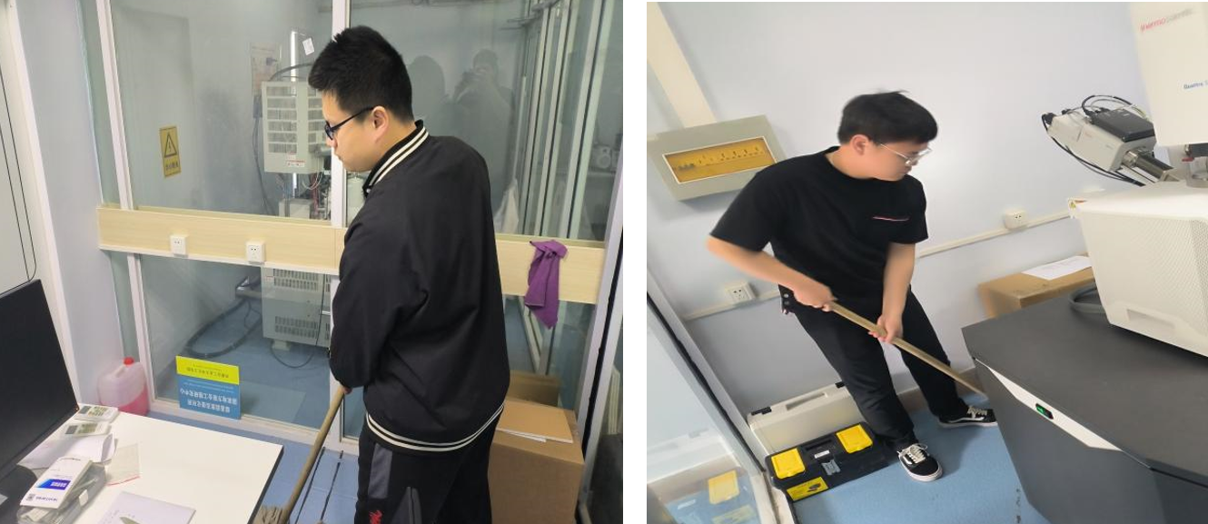 《现代分析测试技术》课程在分析测试中心开展了参观与观摩活动,为了保证本科生观摩前后实验室整洁、使用仪器的同学有良好的实验环境,组织员工对分析测试中心的地面、实验台和仪器设备表面进行清洁。