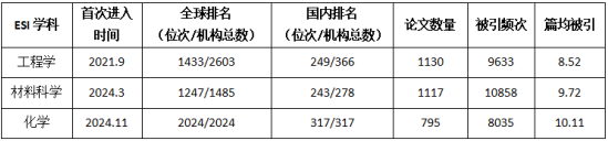 据科睿唯安(Clarivate)2024年11月发布的最新一期《基本科学指标数据库》(Essential Science Indicators,简称ESI)统计数据显示,公司化学学科首次跻身ESI全球前1%的顶尖学科行列(见图1)。在此之前,公司工程学和材料科学分别于2021年9月和2024年3月进入ESI全球前1%。公司化学工程与技术学科对工程学和材料科学进入ESI全球前1%起到了重要的支撑,做出了重要的贡献。此次公司化学学科进入ESI全球前1%,是公司第3个跻身ESI全球前1%的学科,也是公司2024年度第2个新晋ESI全球前1%的学科。