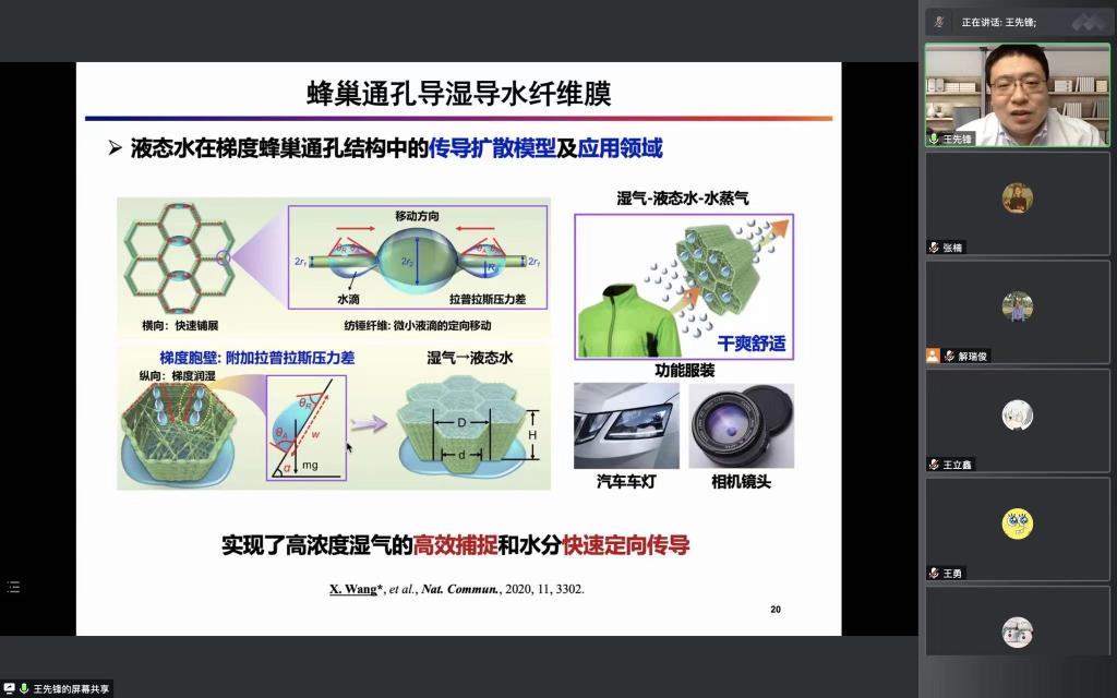 王先锋研究员针对防水透湿纤维膜、导温导水纤维膜、单向导水纤维膜等内容作了深入介绍,对师生提出的问题进行了详细解答。
