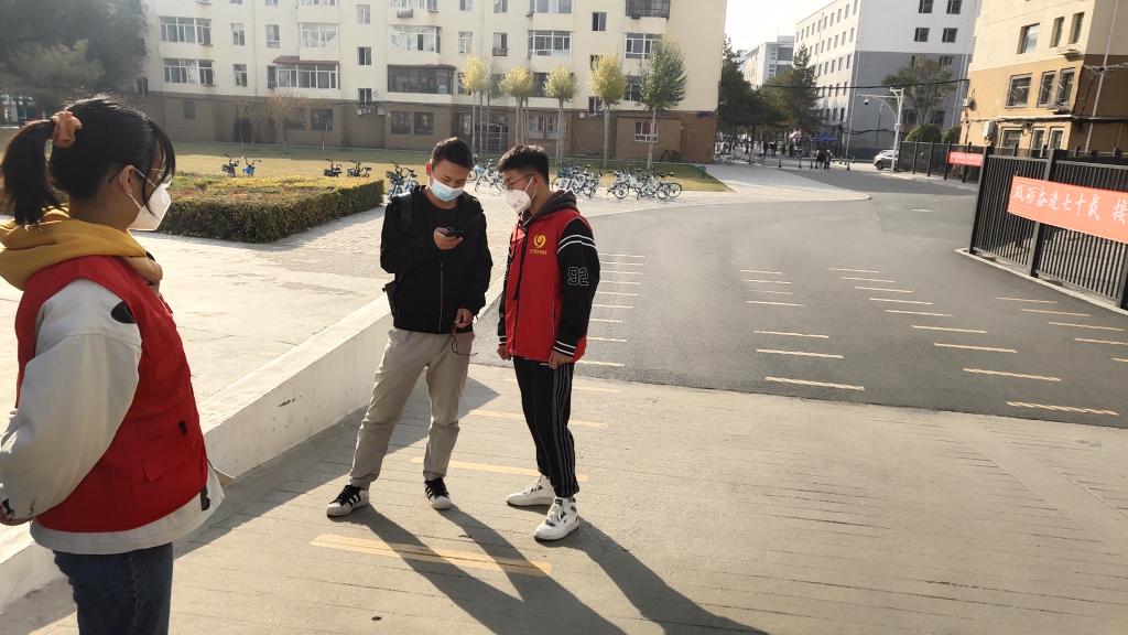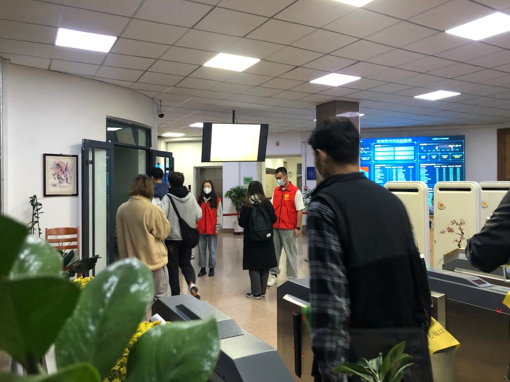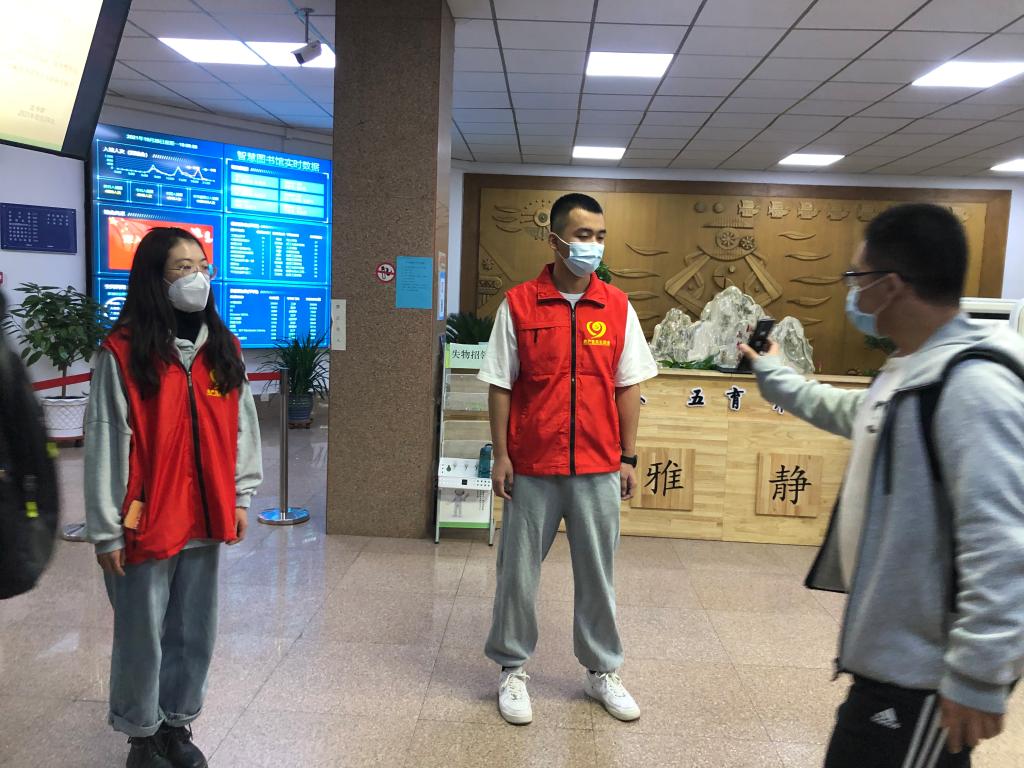 从早晨七点半到晚上七点,由40多名党员、发展对象分成十组在两个地点轮替值班。他们身着党员志愿者服装,在图书馆人流量高峰期引导同学们严格执行“预约入馆”制度,并提醒同学们在馆期间须全程佩戴口罩等疫情防控下的入馆要求。在北区入口处对进出人员进行体温检测及健康码和校园卡等相关证件的检查。