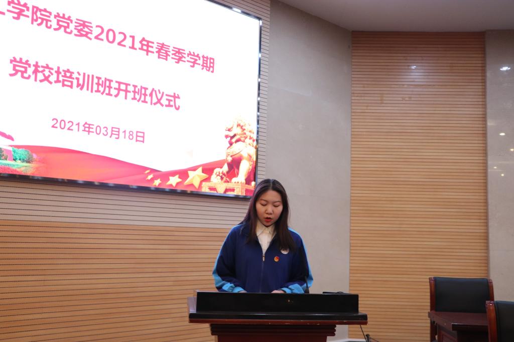 开班仪式上,院团学办公室副主任张宇宣读《公司党委2021年春季学期党校培训学习安排及考核办法》,制药18-2陈天娇同学代表2021年秋季学期党校学员发言。
